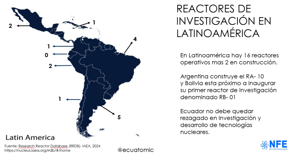 Según la base de datos sobre reactores de investigación del IAEA2 , en Latinoamérica hay 16 reactores de investigación operativos más 2 en construcción. Bolivia está próximo a inaugurar su primer reactor de investigación que forma parte del Centro de Investigación y Desarrollo en Tecnología Nuclear -CIDTN con una inversión estimada de 350 millones de dólares3.