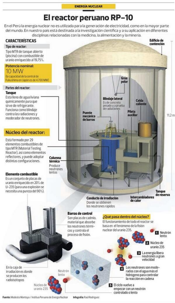 El reactor de investigación más potente de América Latina es el RP-10, ubicado en el Instituto Peruano de Energía Nuclear (IPEN) en Lima, Perú. Este reactor de tipo piscina, con una potencia térmica nominal de 10 MW, ha estado operativo desde 1988 y se utiliza principalmente para la producción de radioisótopos médicos (como Tecnecio Tc-99m,Yodo I-131 y Samario Sm-153), análisis por activación neutrónica y pruebas de materiales4.